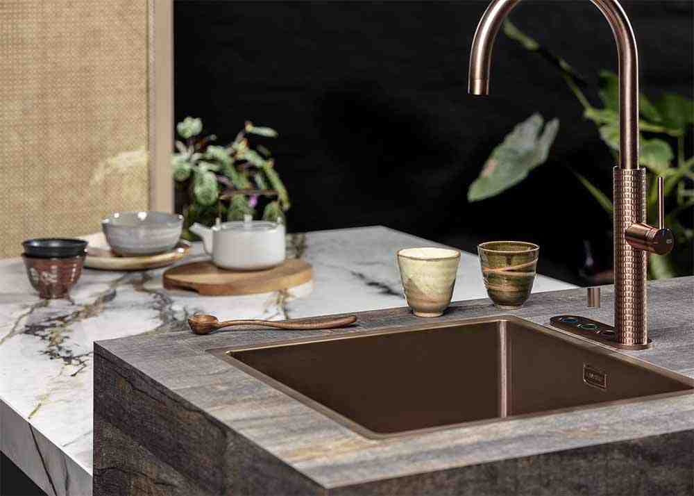 De Rural Chic keuken loopt naadloos over in de living. In de trendvideo hieronder kun je zien hoe er gespeeld is met lage en hoge zitplekken en hoe je door het toepassen van een groen’strook’ een buitenterras gecreëerd is in de keuken. Opvallende elementen zijn bijvoorbeeld het lichtgroene marmeren kookeiland in de kleur Calacatta Green, met een spoelunit met Selsiuz kokendwaterkraan en spoelbak in de kleur Copper.