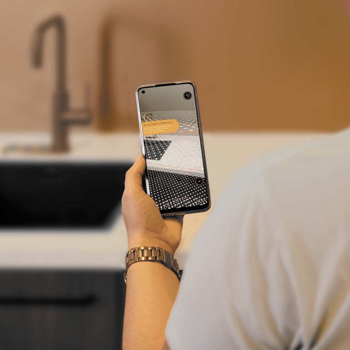 In de MyDekker app kun je ook om het nieuwe keukenblad heenlopen, alsof het er al echt staat. Zo kun je het vanuit elke hoek goed bekijken en weet je zeker dat je de juiste keuze maakt.